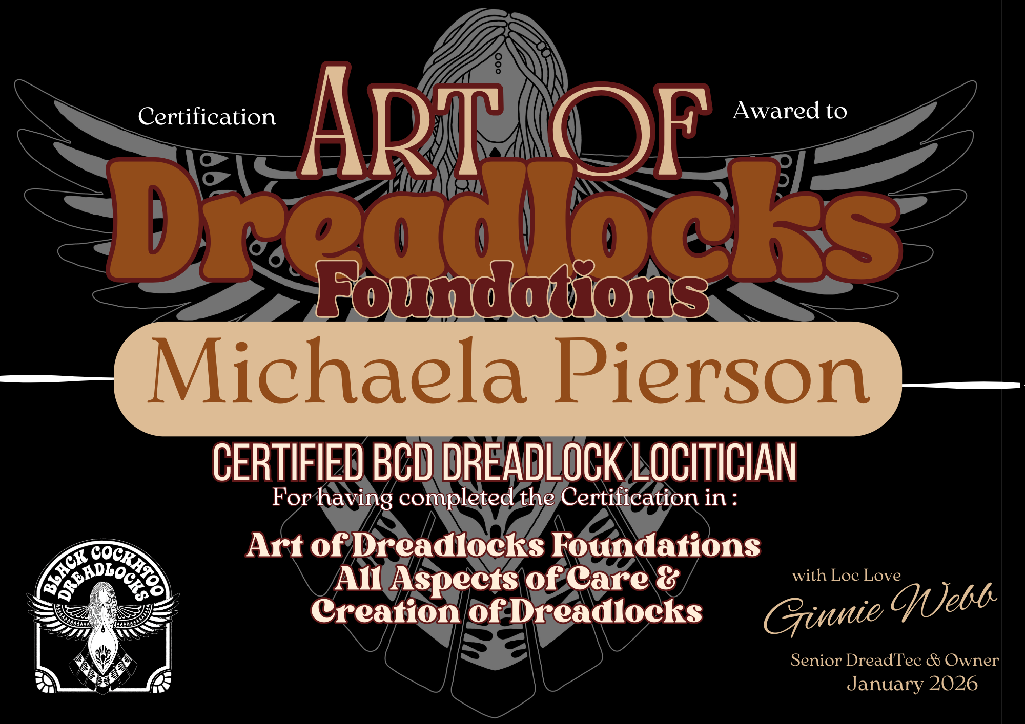 At Black Cockatoo Dreadlocks, we honour dreadlocks as both skill and ceremony. Your certification represents integrity, confidence, and readiness to hold space for clients in a real and professional way.